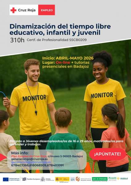 El Plan de Empleo de Cruz Roja «Proyecto Aceleradores Go de empleo Juvenil» ofrece el curso de Dinamización del tiempo libre educativo, infantil y juvenil, de 340 horas de duración. Se trata de un certificado de profesionalidad del SEXPE, que se llevará a cabo en modalidad on line y que contará con tutorías en la ciudad de Badajoz.